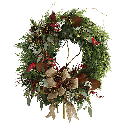 A burlap ribbon and spray of red berries brings a festive touch to this beautifully rustic flat cedar wreath. The perfect addition for your holiday decor!